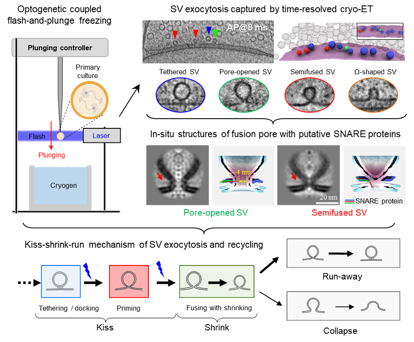 2025年10月16日,中国科学技术大学(中国科大)/中国科学院深圳先进技术研究院(深圳先进院)毕国强、刘北明、陶长路团队,联合美国加州大学洛杉矶分校周正洪团队、山东农业大学王培毅团队、以及深圳先进院孙坚原团队,在Science期刊发表题为“Kiss-shrink-run” unifies mechanisms for synaptic vesicle exocytosis and hyperfast recycling的研究论文。利用自主研发的毫秒级时间分辨冷冻电镜成像技术,破解了神经信息传递过程中,突触囊泡释放与快速回收的完整生物物理过程,并提出了“亲吻-收缩-逃逸/融合”(Kiss-Shrink-Run/Collapse)的全新模型,统一了半个世纪以来关于突触囊泡释放与快速回收机制的争议问题。